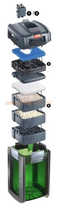 Gigant pośród zewnętrznych filtrów kubełkowych, zapewnia krystalicznie czystą i idealną biologicznie wodę. Oprócz ogromnej pojemności posiada 2 opatentowane cechy. W celu unikniecia problemu "martwej wody" posiada dwa wloty i jeden wylot. Posiada również łatwy w montazu przedfiltr usuwajacy większe cząstki brudu, które zatrzymane na nim nie zakłócają głownych mediów biologicznych. Dzieki temu odstepy czasu pomiedzy czyszczeniami znacząco sie wydłużają.