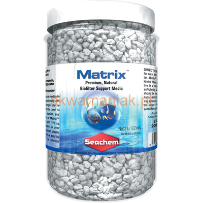 Średnica każdej granulki waha się w okolicach 10mm, a ich powierzchnia całkowita na 1l to około 700m2 (jest to wartość odpowiadająca 170l plastikowych bioballi). Seachem Matrix 1l jest chemicznie obojętny i nie ulega rozkładowi. Nie trzeba go wymieniać (granulki można przepłukiwać). Można go stosować zarówno w zbiornikach morskich, rafowych i słodkowodnych.
