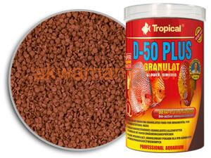 Wybarwiający pokarm granulowany z wysoką zawartością białka (50%), przeznaczony do codziennego karmienia paletek oraz innych gatunków ryb o dużych wymaganiach pokarmowych. Niezwykła wartość odżywcza granulatu D-50 PLUS GRANULAT sprawia, że jest to idealny pokarm dla tarlaków i młodych ryb. Zawarte w pokarmie kalmary i kryl wpływają na smakowitość pokarmu oraz są źródłem łatwostrawnego białka, bogatego w aminokwasy egzogenne. Wysoka zawartość naturalnej astaksantyny, między innymi z glonów Haematococcus pluvialis odpowiada za intensywne kolory ryb. Odporność na choroby zwiększa naturalny immunostymulator – beta-glukan. Ryby systematycznie karmione tym pokarmem są żywotne, zdrowe i chętnie przystępują do tarła. Polecamy stosowanie również innych przeznaczonych dla paletek pokarmów marki Tropical.