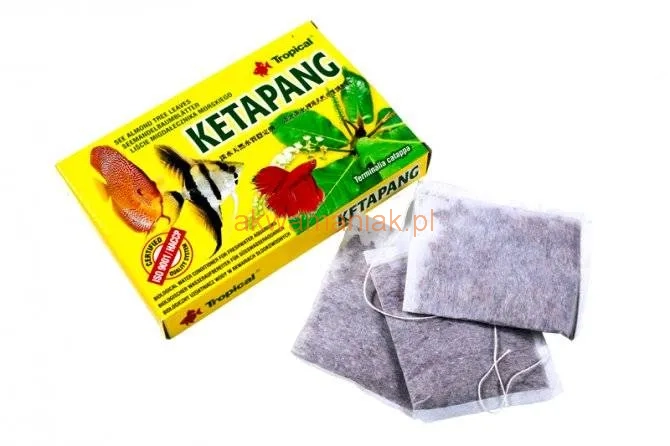 KETAPANG to suszone i rozdrobnione liście migdałecznika morskiego (Terminalia catappa), które w naturalny sposób poprawiają jakość wody akwariowej. KETAPANG wprowadza do wody naturalne garbniki oraz nieznacznie obniża pH wody, nadając jej właściwości zbliżone do biotopu czarnych wód. Uwalniane z liści substancje przyspieszają regenerację naskórka, błony śluzowej i płetw hodowanych ryb oraz zmniejszają ryzyko pojawienia się pleśniawki, dlatego zaleca się stosowanie migdałecznika po wymianie wody oraz po transporcie ryb i w okresie ich adaptacji w nowym akwarium. Migdałecznik użyty w akwarium tarliskowym chroni ikrę przed pleśnieniem i znacznie poprawia wylęgalność i przeżywalność narybku. Stosujemy jedną saszetkę KETAPANG na 150-200 litrów wody. Saszetki wymieniamy po upływie dwóch tygodni.